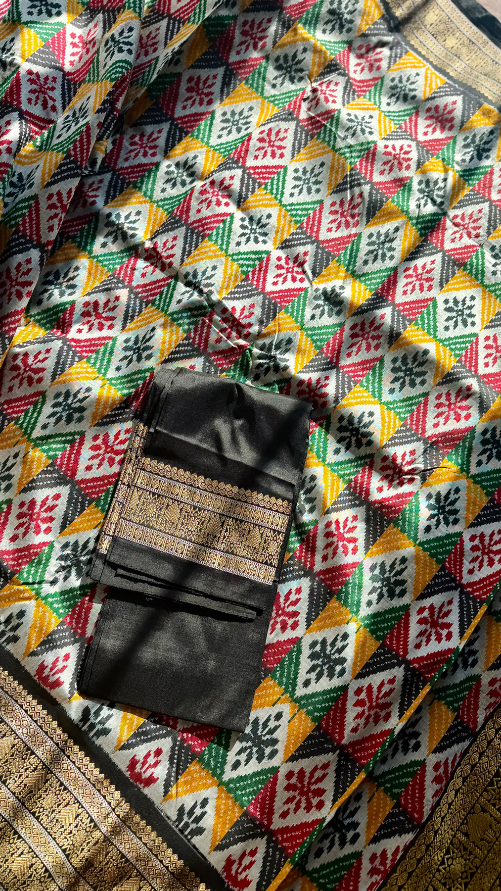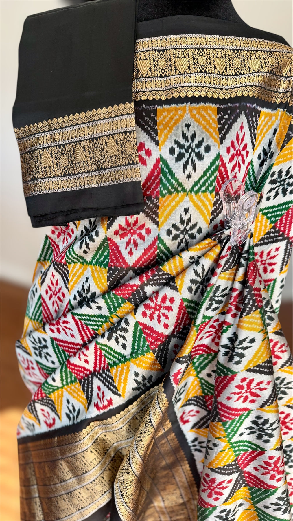 Indulge in the fusion of traditional and modern design with our Ikkat multi color fusion Silk Saree with kanchipuram border and pallu. Handloomed with pure silk, its intricate Zari woven body, border and pallu add an elegant touch. Experience luxurious comfort and elevate your style with this unique saree. Perfect for any occasion.