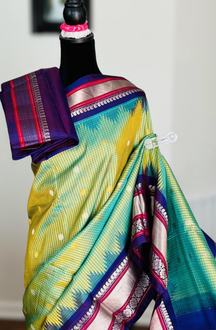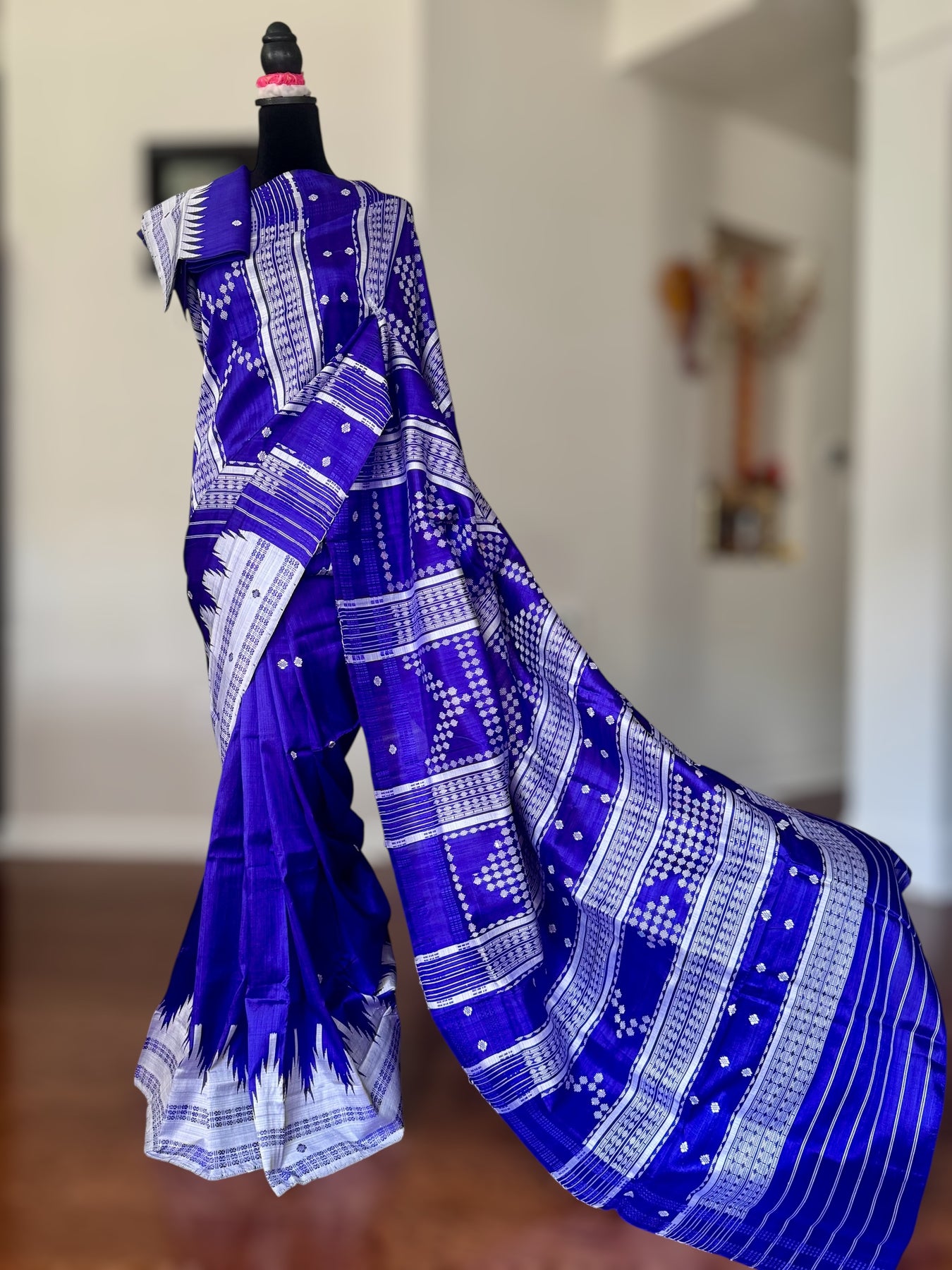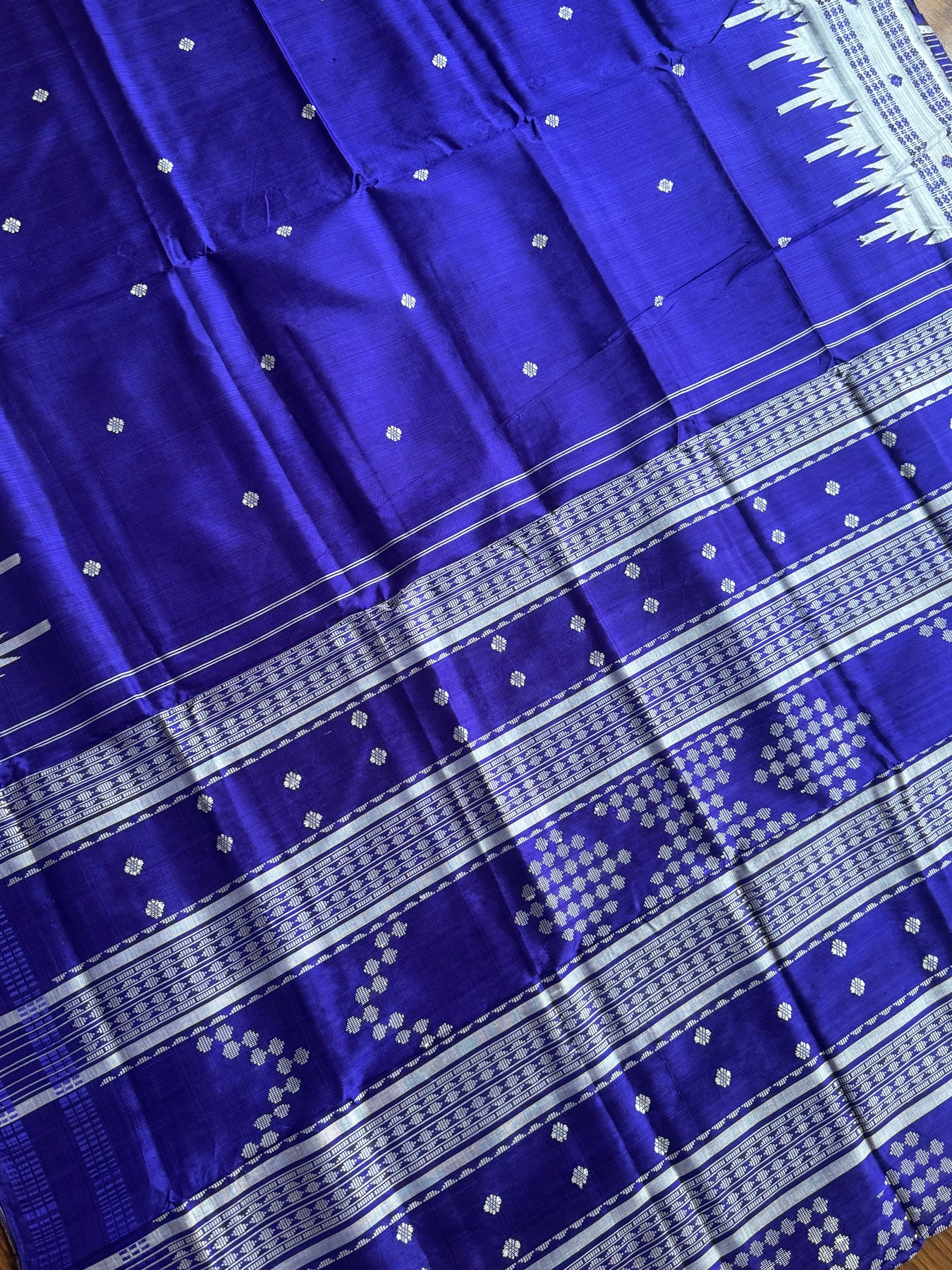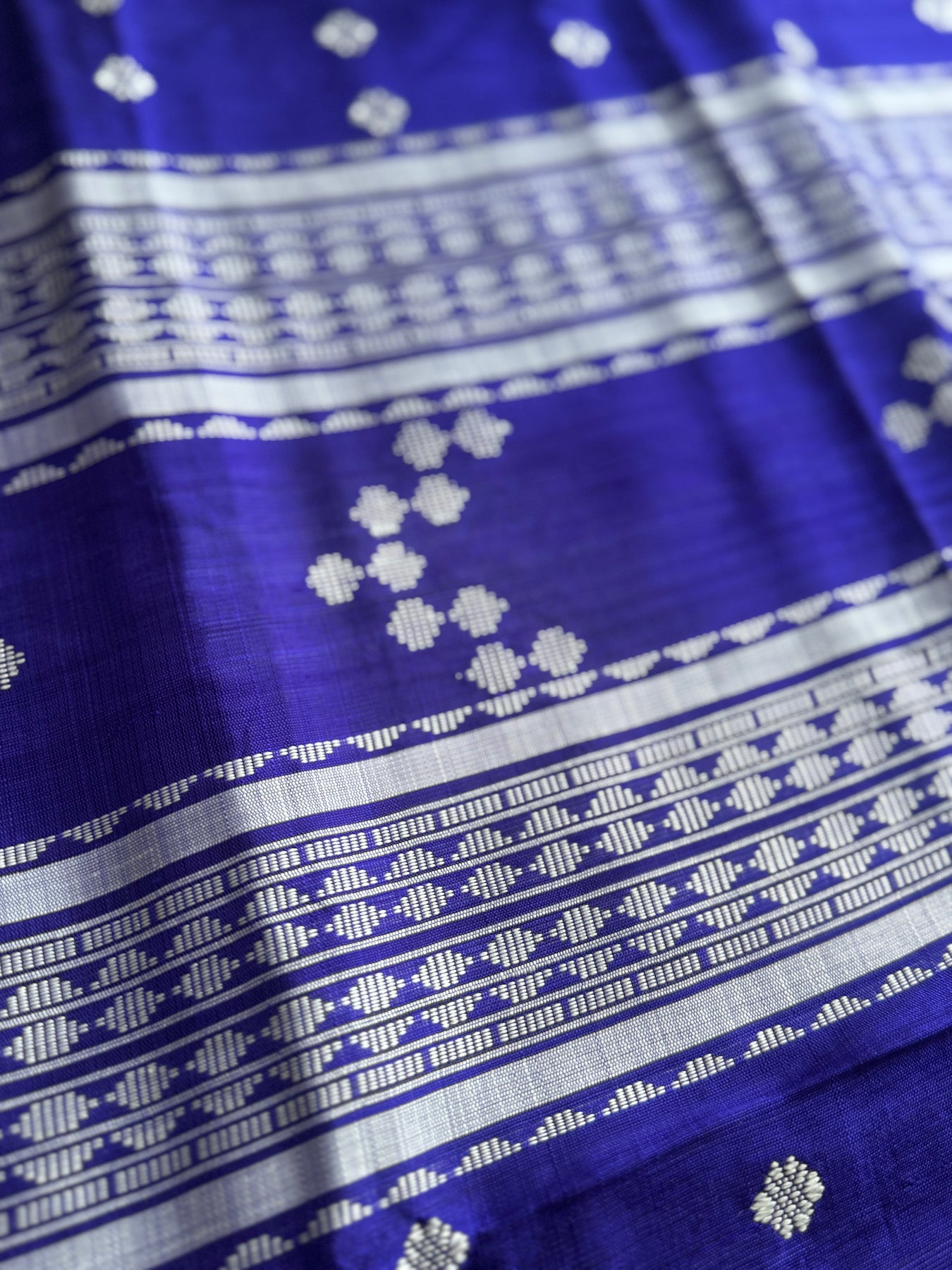 This Double Pallu Berhampuri Silk Saree in rich Indigo showcases intricate handwoven designs with delicate geometric motifs. Featuring a unique double pallu for added elegance and a contrasting silver border with rudraksh and traditional phoda kumbha (temple design), this saree is perfect for special occasions, blending traditional artistry with timeless style.