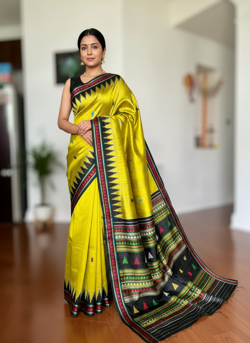 Light green and black combination Dongria double pallu contemporary ikat pure silk saree
